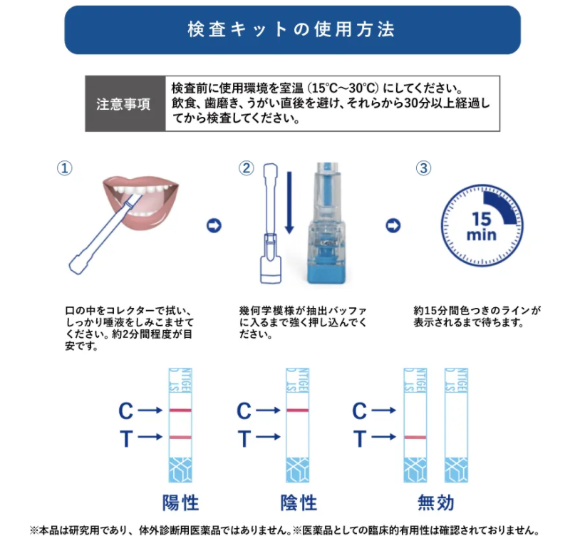 特殊な装置や専門知識も必要ありません。唾液を採取するだけ。約15分程度で検査結果がすぐわかります。